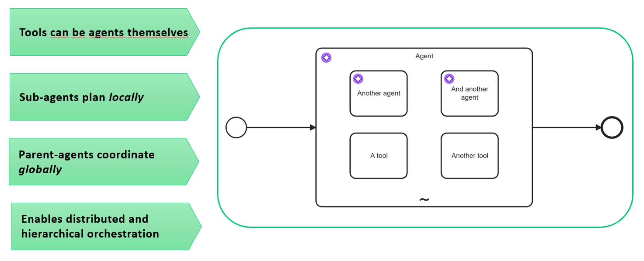 Technisch ist das Ganze genial einfach und basiert auf Ad-Hoc Suprozessen. Ad-Hoc-Subprozesse in BPMN sind spezielle Teilprozesse, deren enthaltene Aktivitäten ohne festgelegte Reihenfolge und nach Bedarf ausgeführt werden können. Sie dienen dazu, flexible Abläufe innerhalb eines Prozesses darzustellen, bei denen nicht von vornherein bekannt ist, welche Schritte in welcher Reihenfolge notwendig sind. Klingelt es schon? In Camunda gibt es nun die Option, zur Steuerung der Aktivitäten eines solchen Ac-Hoc-Subprozesses optional auch einen KI-Agenten einzusetzen, der die enthaltenen möglichen Aktivitäten als Tools zur Verfügung gestellt bekommt. KI entscheidet über den nächsten Prozessschritt. Und darüber, ob wir nun fertig sind.
