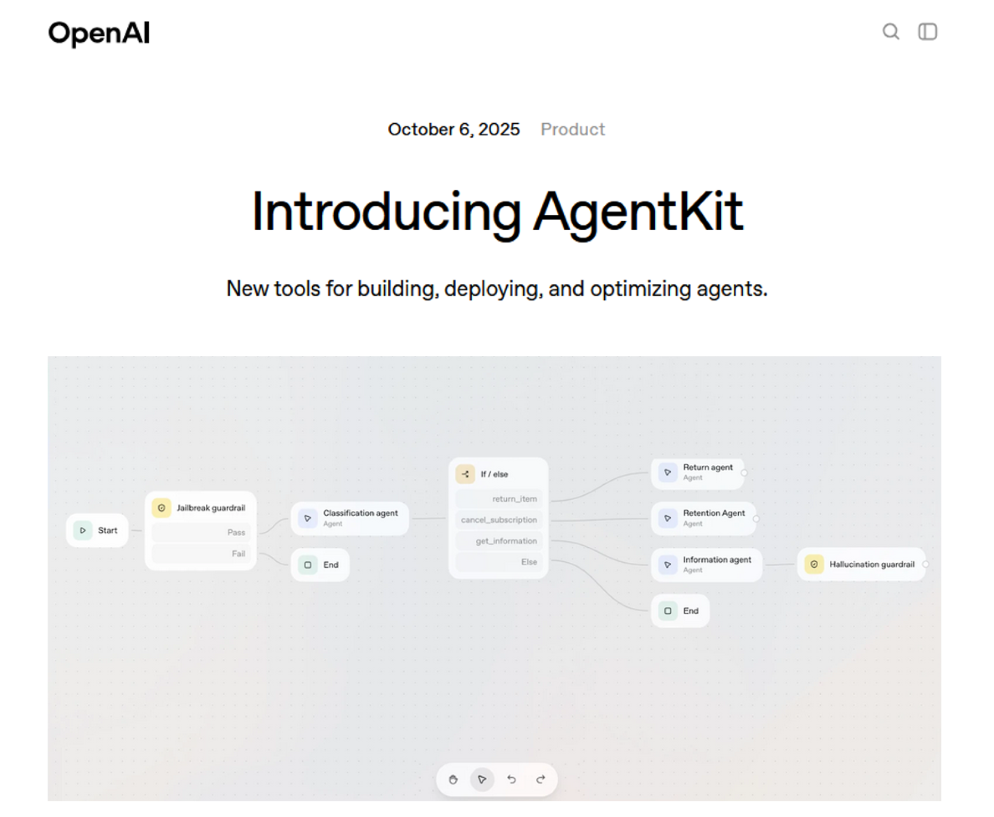 Until now, building agents meant juggling fragmented tools—complex orchestration with no versioning, custom connectors, manual eval pipelines, prompt tuning, and weeks of frontend work before launch. With AgentKit, developers can now design workflows visually and embed agentic UIs faster using new building blocks.OpenAI